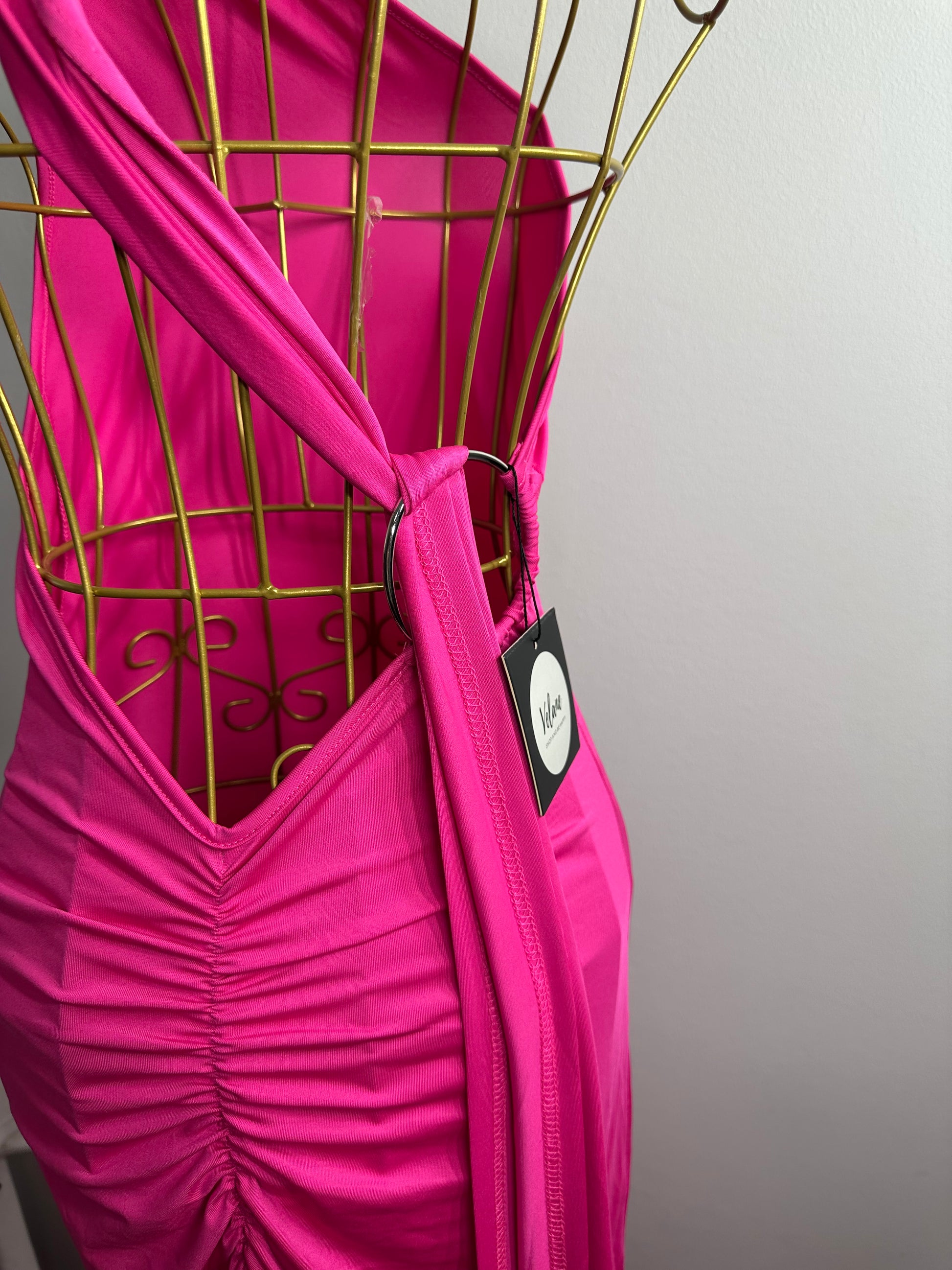 Rochie cu spatele gol, cu accesoriu in zona soldului, lunga cu spatele gol.
