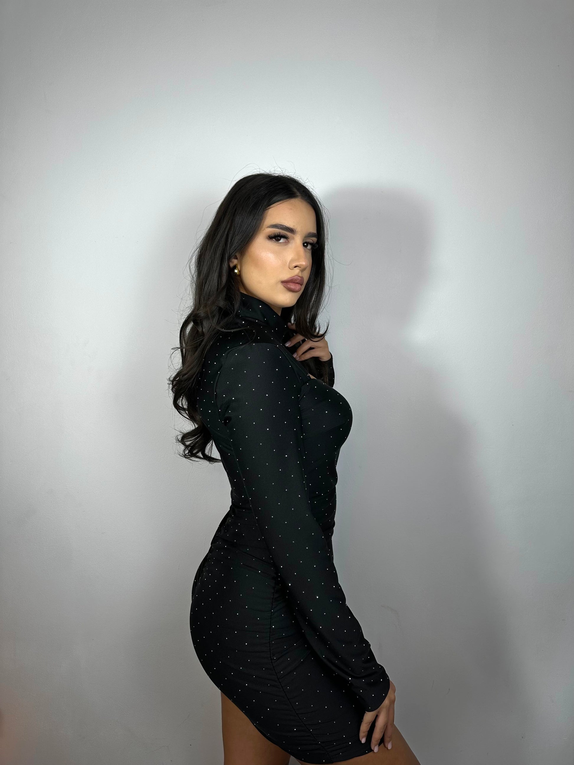 O rochie mini neagră cu cristale și decupaj la gât