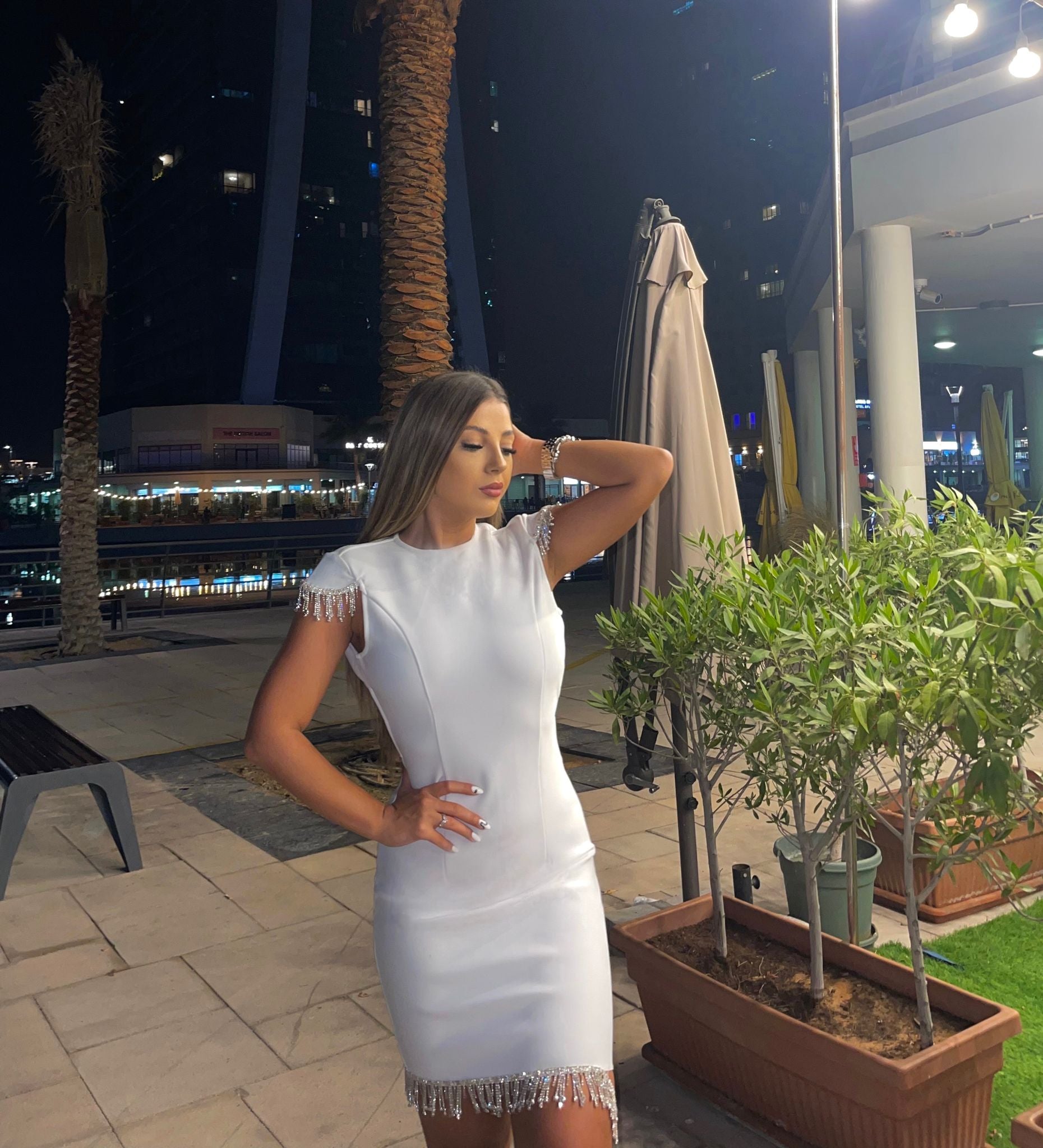 Rochia este cu spatele gol tip bandage, cu detalii din cristale atat in partea de jos cat si la umeri ( prevazuti cu buretei) .