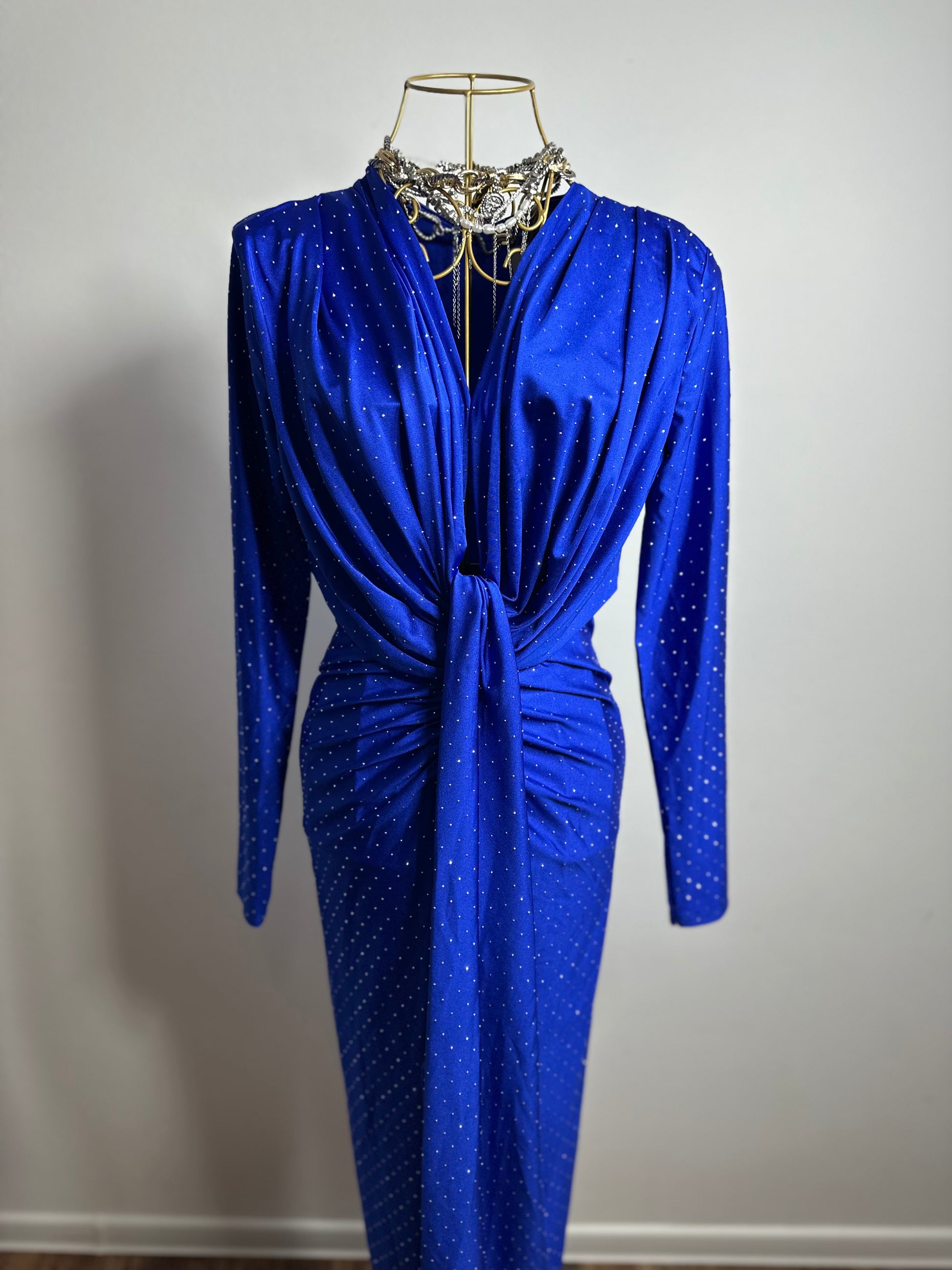 Partea inferioară a rochiei este despicată pe un picior, oferind un contrast senzual și o libertate de mișcare grațioasă. Umerii sunt accentuați cu bureți