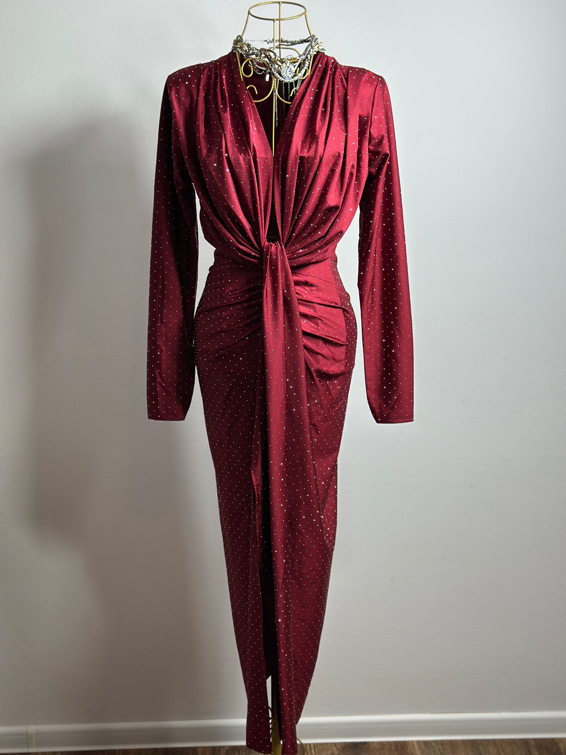 Partea inferioară a rochiei este despicată pe un picior, oferind un contrast senzual și o libertate de mișcare grațioasă. Umerii sunt accentuați cu bureți