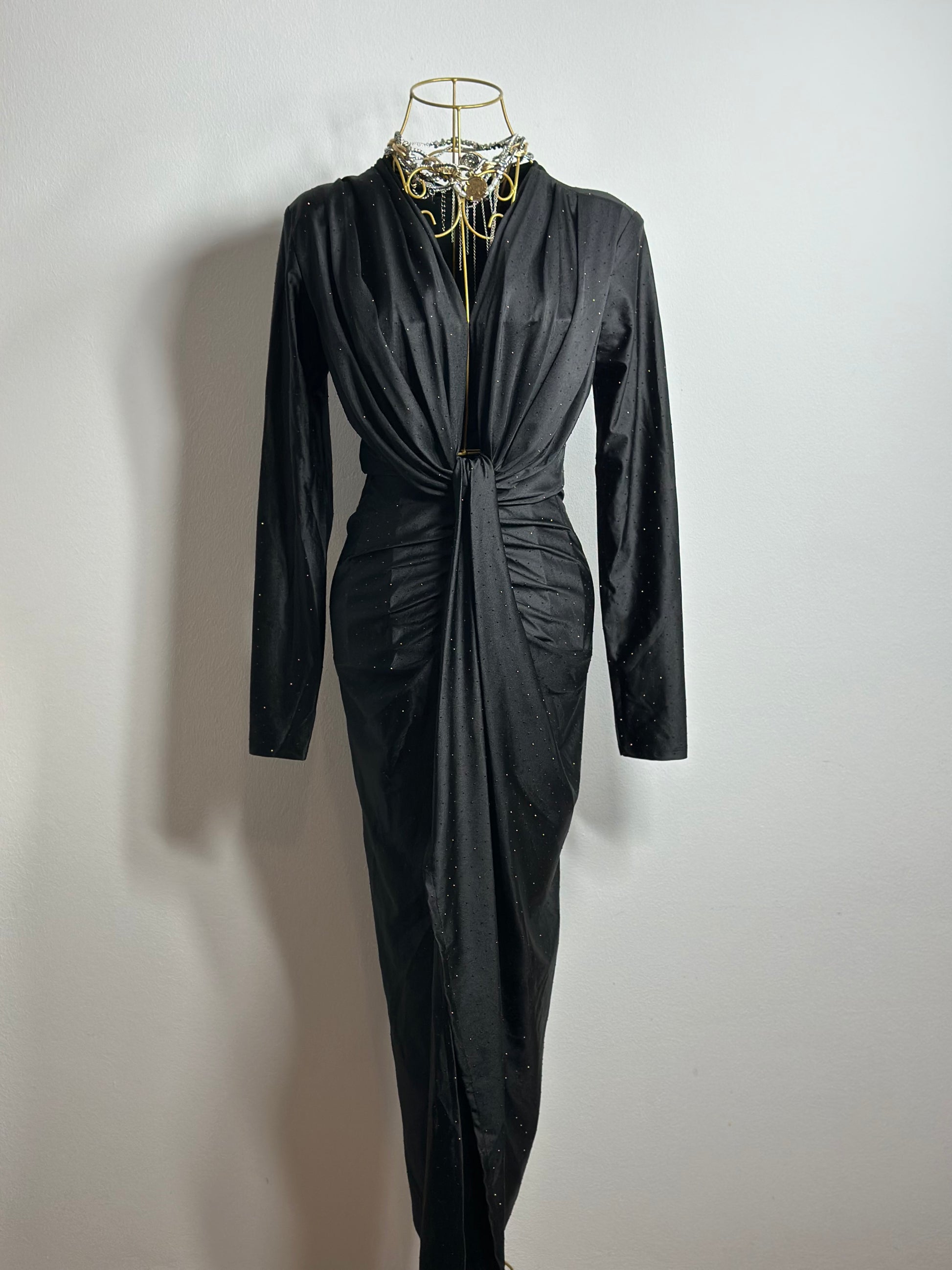 Această rochie sofisticată strălucește subtil datorită țesăturii cu glitter fin, care adaugă rafinament și un aer prețios. Croiala este gândită pentru a camufla talia, având o formă ușor lejeră în zona mijlocului, cu pense sau drapaje discrete care conferă un efect sculptant și elegant.