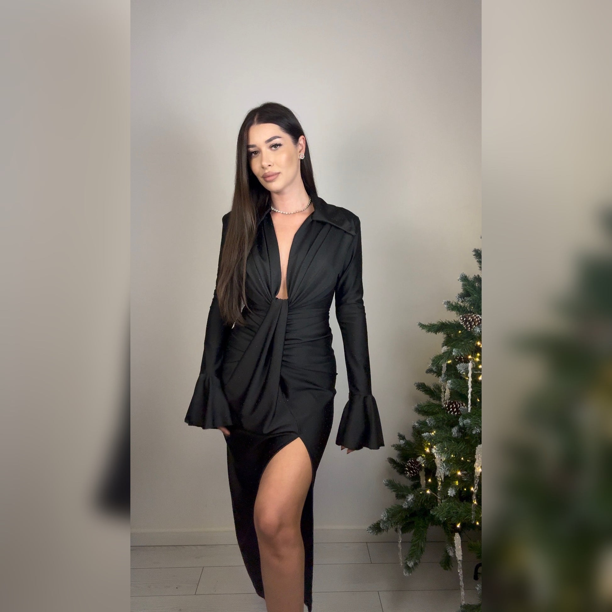 Această rochie sofisticată strălucește subtil datorită țesăturii cu glitter discret care adaugă rafinament și un aer prețios. Croiala este gândită pentru a camufla talia, având o formă ușor lejeră în zona mijlocului, cu pense sau drapaje discrete care conferă un efect sculptant și elegant.