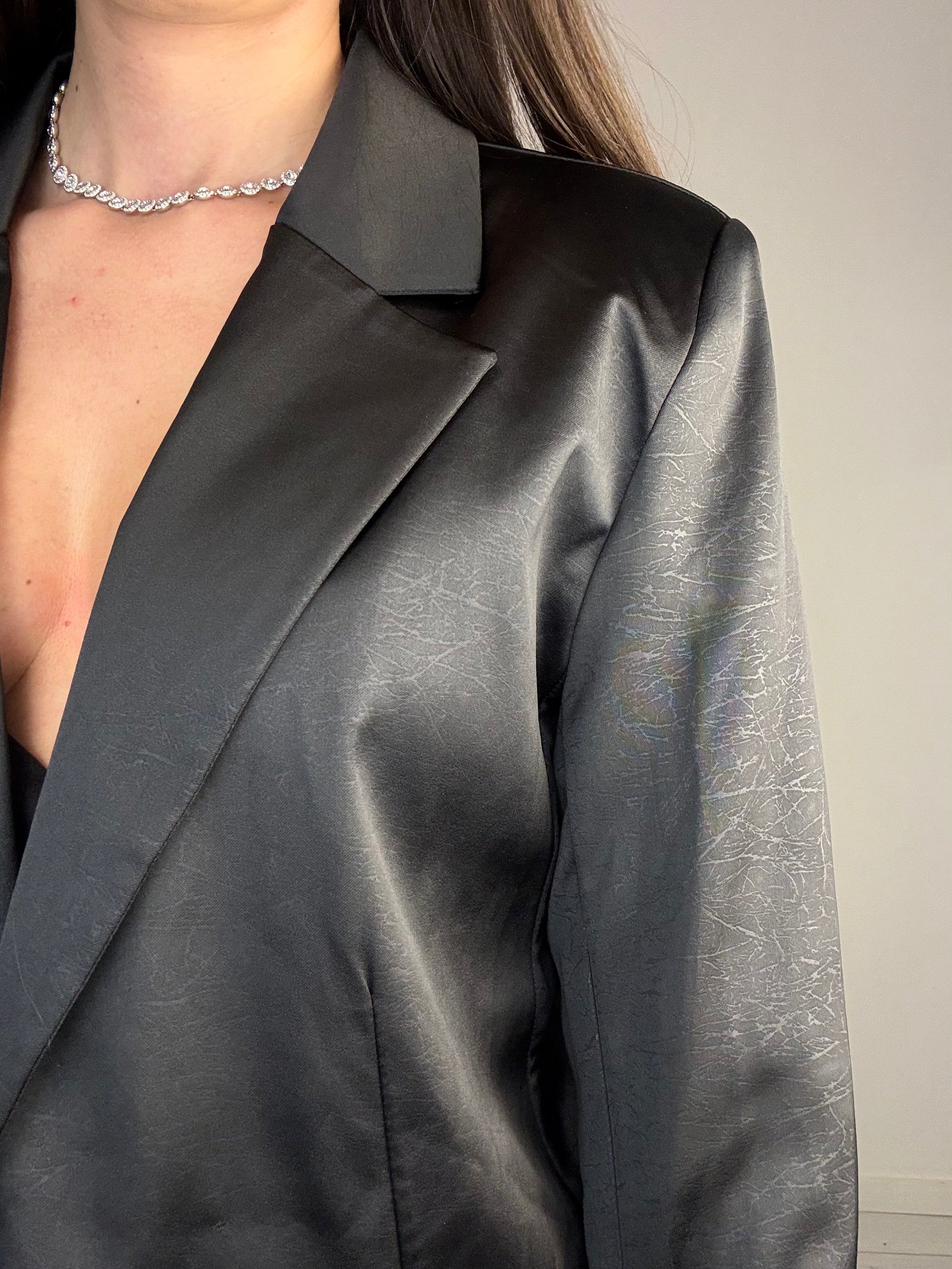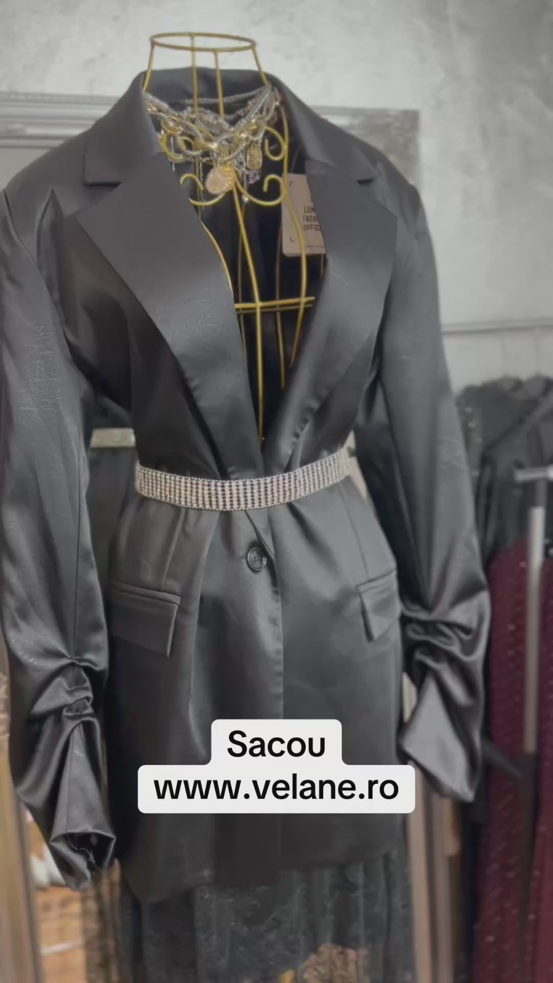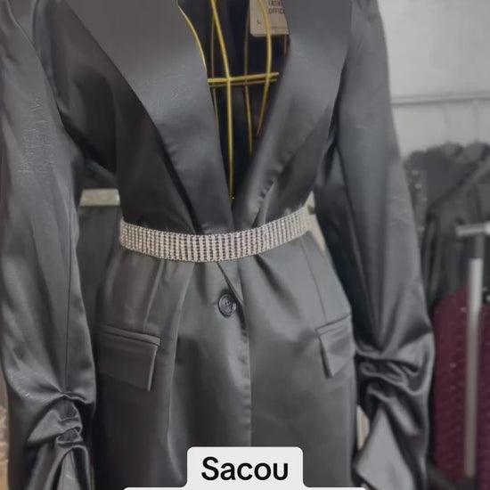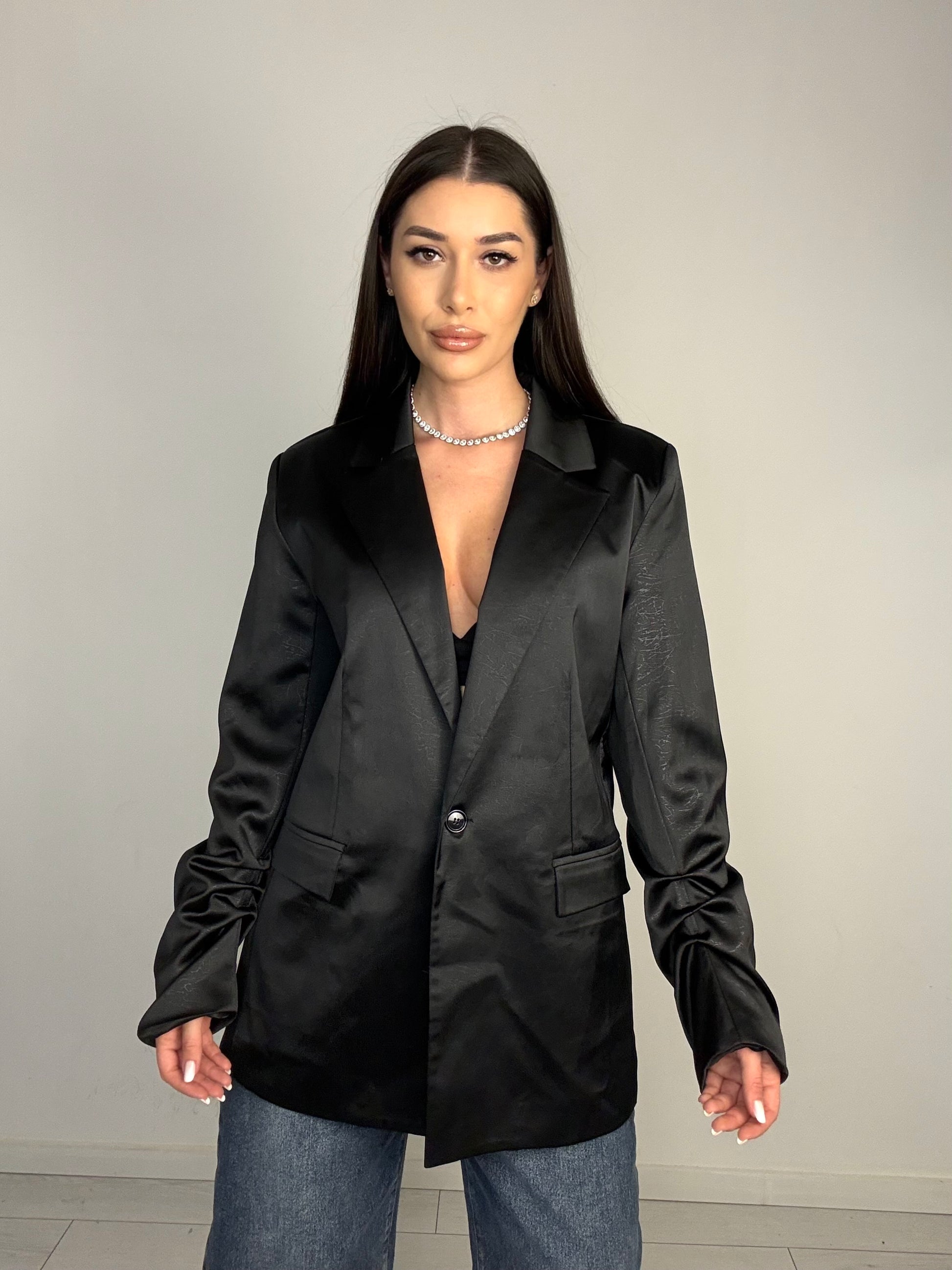Sacou lucios, cu mâneci ușor drapate și croială oversize, prevăzut cu căptușeală ce se prelungește peste șolduri. O piesă statement, modernă și versatilă, care oferă un plus de rafinament oricărei ținute, asigurând totodată confort și lejeritate în mișcare.