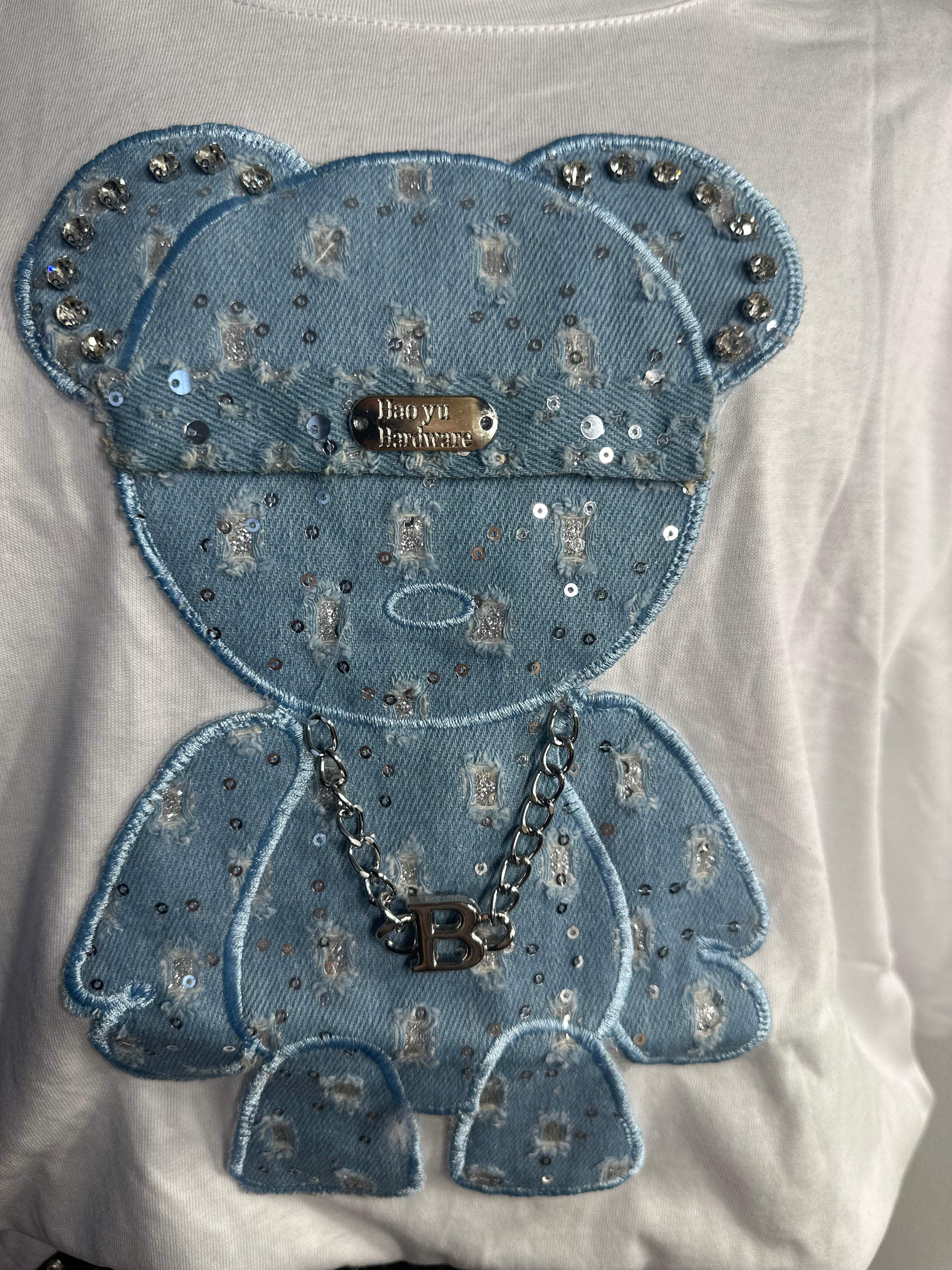 Tricou lung la modă din bumbac, super calitativ cu lanț si ursulet in nuanta albastra oversize cu pietre si sclipici